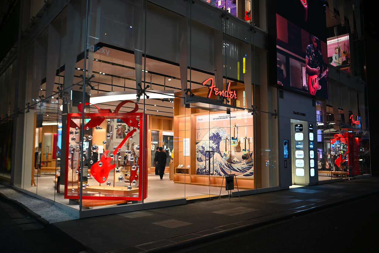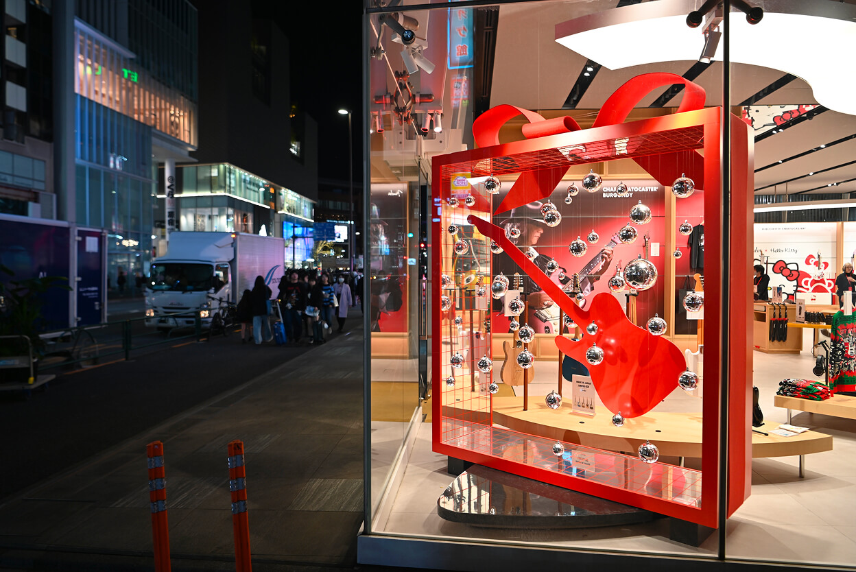 ギターとベースで知られる世界的な楽器ブランド、フェンダーの世界初となる旗艦店「FENDER FLAGSHIP TOKYO」におけるクリスマスのシーズナルディスプレイのプロジェクト。同店は、東京・原宿の明治通り沿いに位置するビルの地下1階から地上3階にあり、ギターのカスタマイズに対応するフロアやカフェ、アパレルショップを含む大型店の1階における計画でした。ディスプレイでは、同ブランドのストラトキャスターをモチーフにした巨大なギフトボックスを立体的に製作してストアフロントのコーナーに設置し、街ゆく人にクリスマスの活気を伝えています。