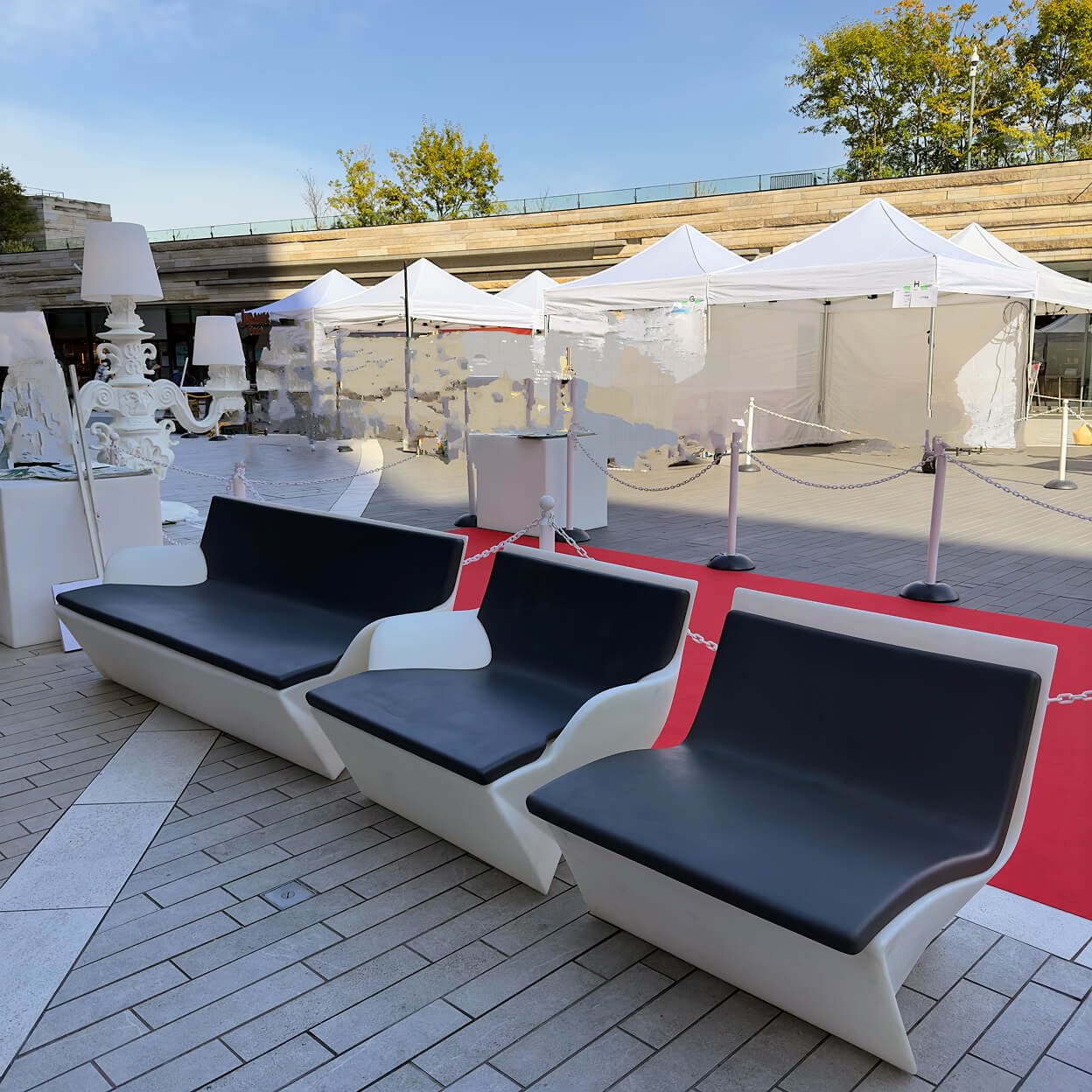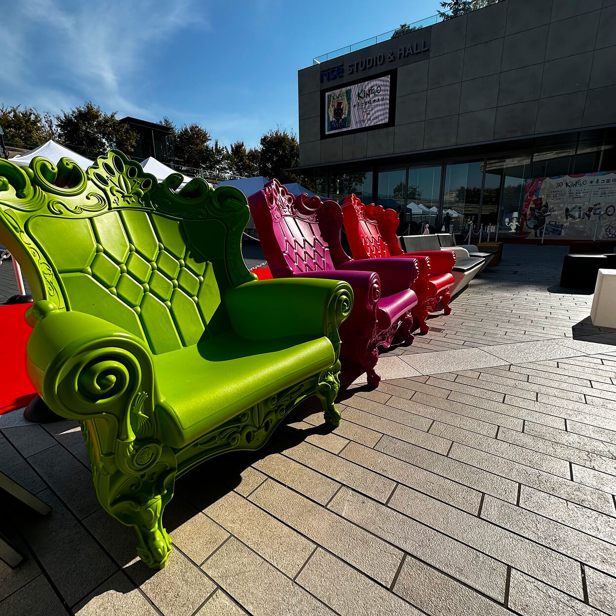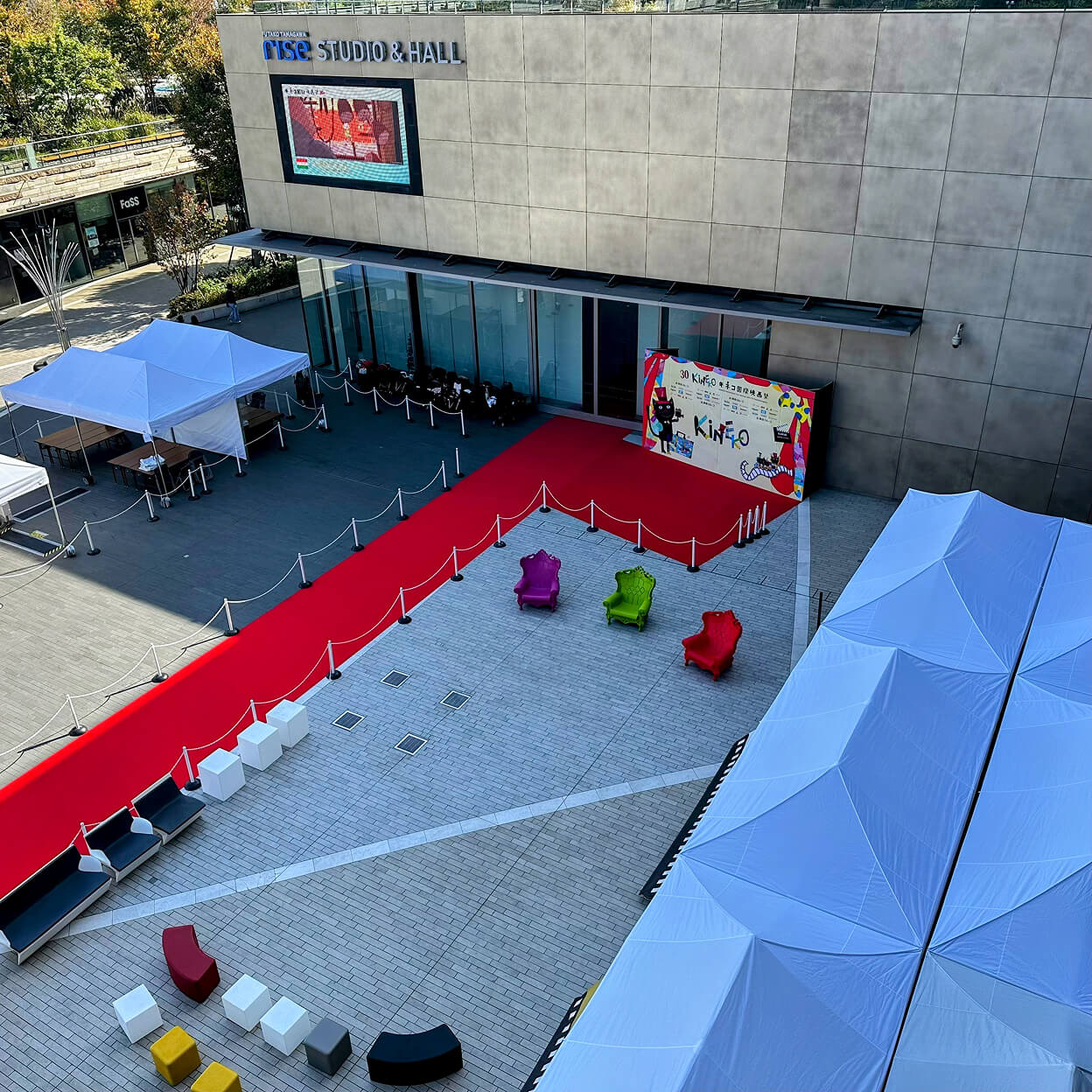 上映会場に至るアプローチでは、来場者を迎える “レッドカーペットゲート”のデザインと施工を手掛け、来場者に印象づける空間演出をしています。また、マルシェエリアと店舗エリアにはスイス生まれの高品質イベントテント、プロテントを設置。屋内外で使用できる、SLIDEのカラフルでポップな家具を会場の随所に設けることで、華やかな場づくりを手掛けました。
