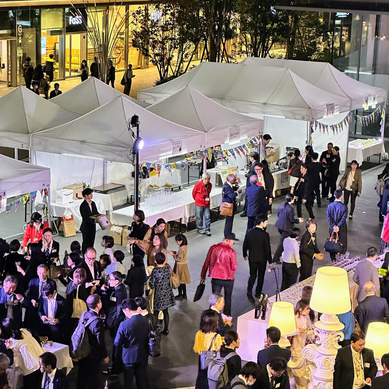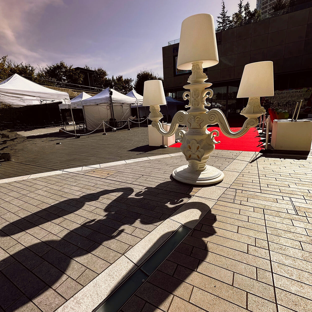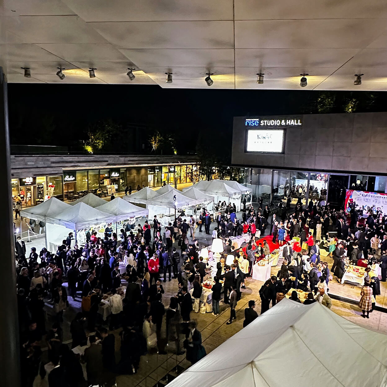 上映会場に至るアプローチでは、来場者を迎える “レッドカーペットゲート”のデザインと施工を手掛け、来場者に印象づける空間演出をしています。また、マルシェエリアと店舗エリアにはスイス生まれの高品質イベントテント、プロテントを設置。屋内外で使用できる、SLIDEのカラフルでポップな家具を会場の随所に設けることで、華やかな場づくりを手掛けました。