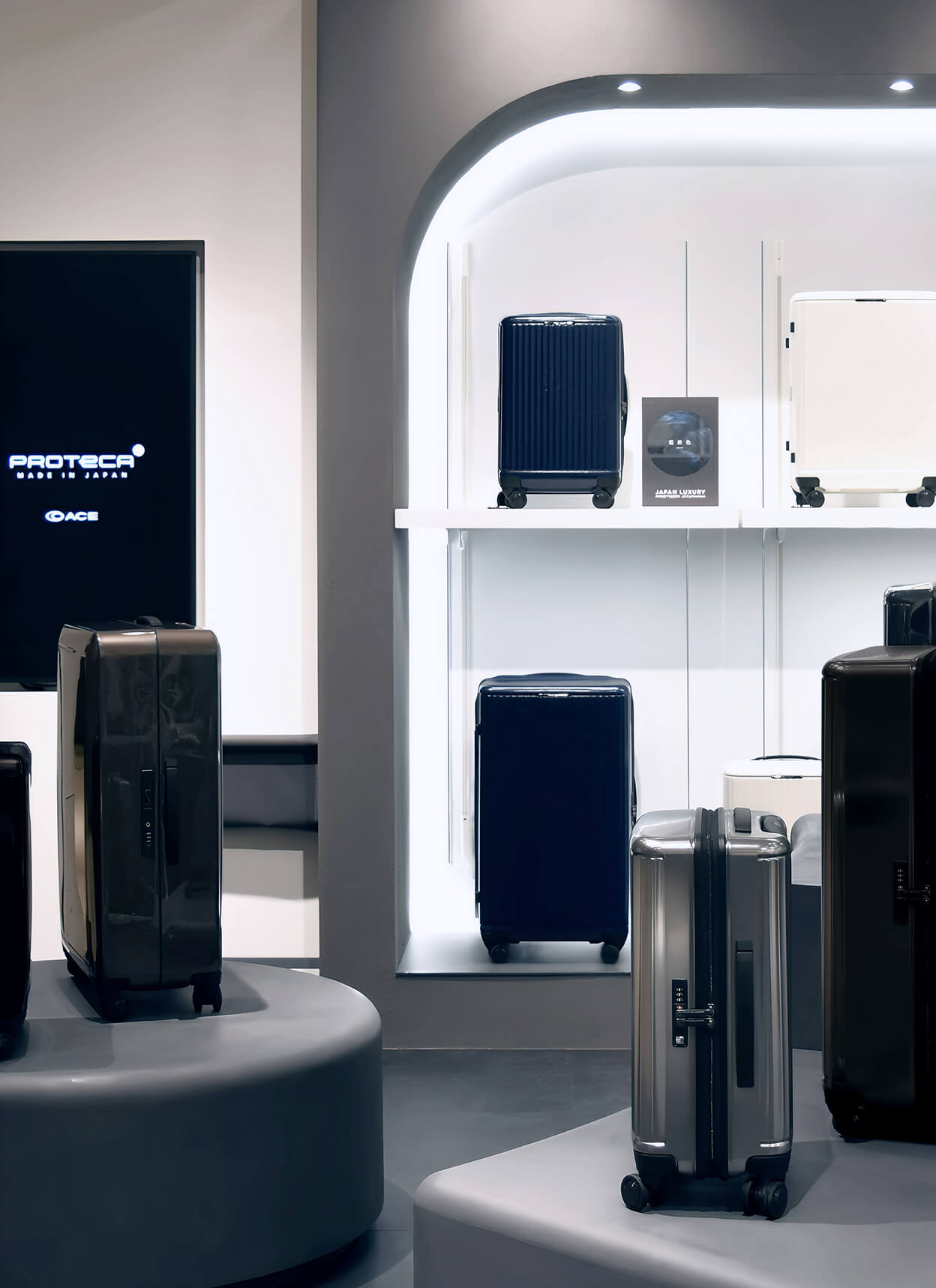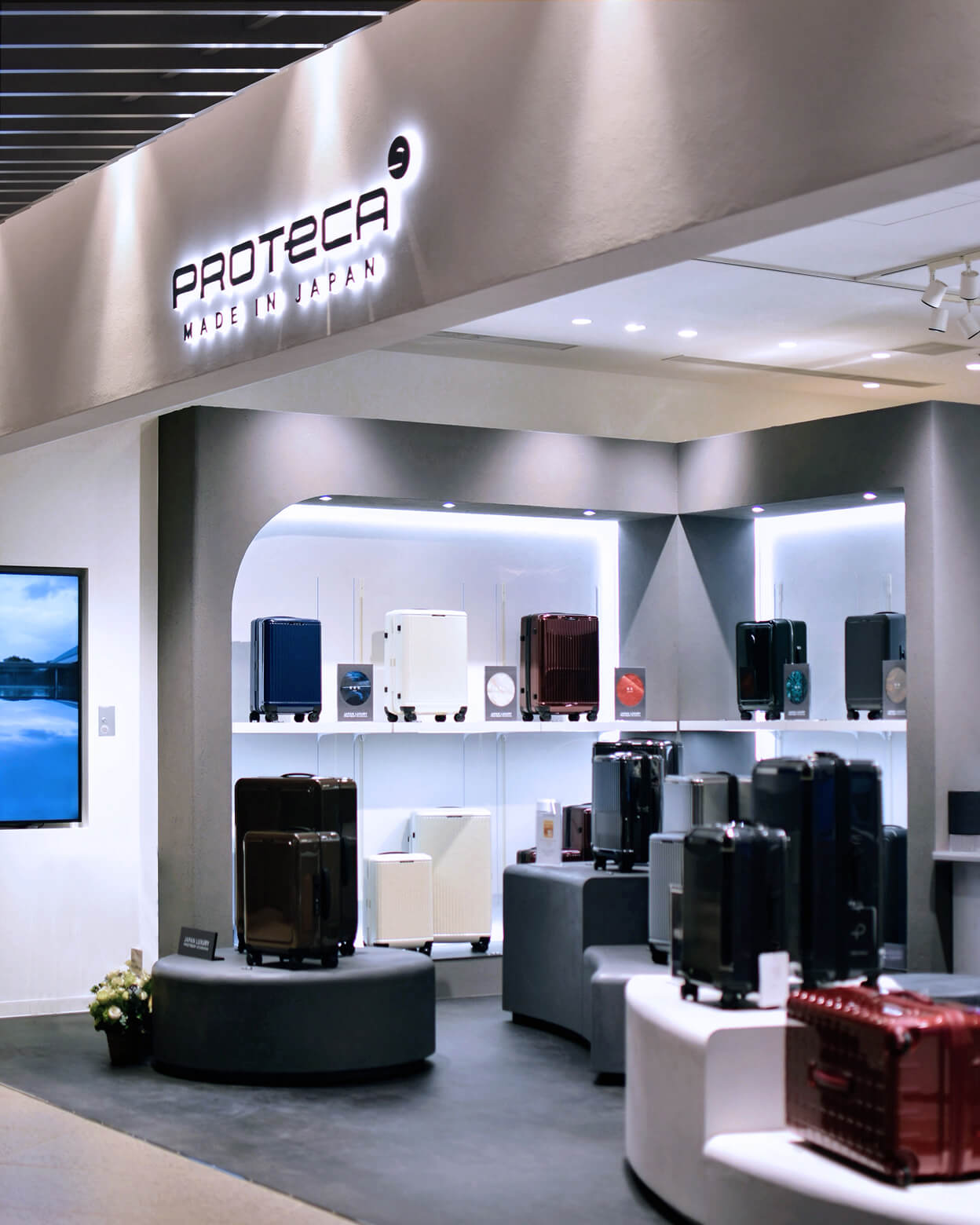 Made in Japan の高品質・高機能で知られるラゲージブランド「プロテカ」のストアデザイン。日本ならではの美意識を表現するため、“枯山水”をテーマに、伝統的なフォルムを現代的に解釈しながらデザインした空間です。モノトーンを基調としたミニマルなデザインの中に曲線を織り交ぜることで独特のリズムをつくり出し、上質なトラベルブランドにふさわしい空間を創出しました。