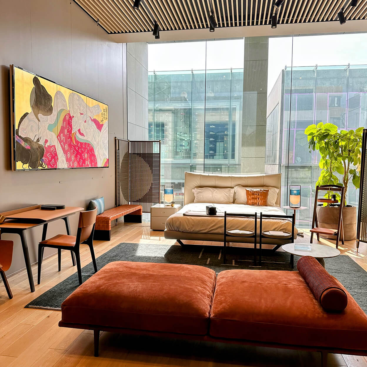 イタリアを代表するラグジュアリー家具ブランド、ポルトローナ・フラウ東京青山の店内で開催された、書家/藝術家の紫舟氏による展示「紫舟展 〜伝統表現を超えてゆく〜」。DESIGNART TOKYOの展示の一つとして、浮世絵、春画や、書と絵が融合した書画の、筆で描かれた線の一つひとつを中空に浮かせて見せる作品が並びました。上質な家具が並ぶインテリアに、紫舟氏による唯一無二のアートという組み合わせが、多くの来場者を集めたこの展示会で、私たちはアートワークの設営を担当しています。