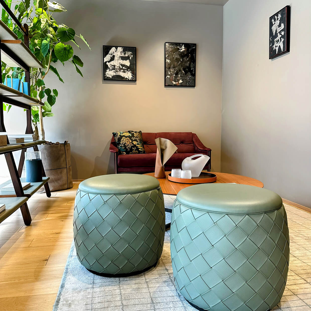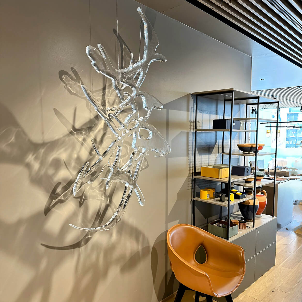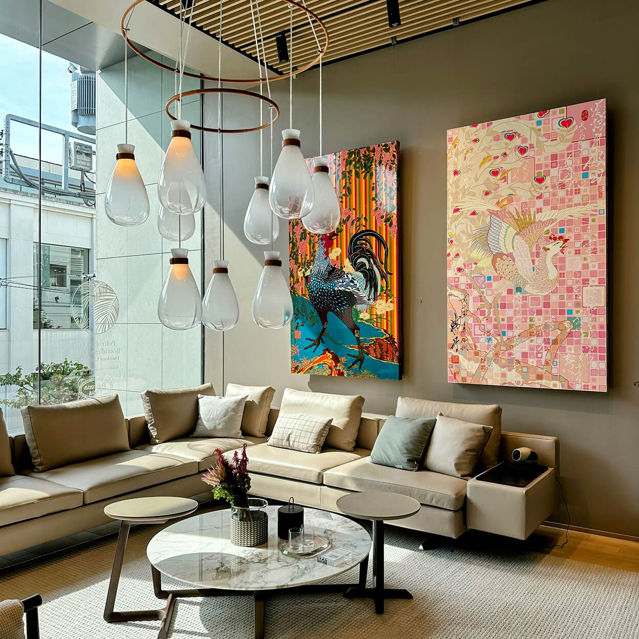 イタリアを代表するラグジュアリー家具ブランド、ポルトローナ・フラウ東京青山の店内で開催された、書家/藝術家の紫舟氏による展示「紫舟展 〜伝統表現を超えてゆく〜」。DESIGNART TOKYOの展示の一つとして、浮世絵、春画や、書と絵が融合した書画の、筆で描かれた線の一つひとつを中空に浮かせて見せる作品が並びました。上質な家具が並ぶインテリアに、紫舟氏による唯一無二のアートという組み合わせが、多くの来場者を集めたこの展示会で、私たちはアートワークの設営を担当しています。