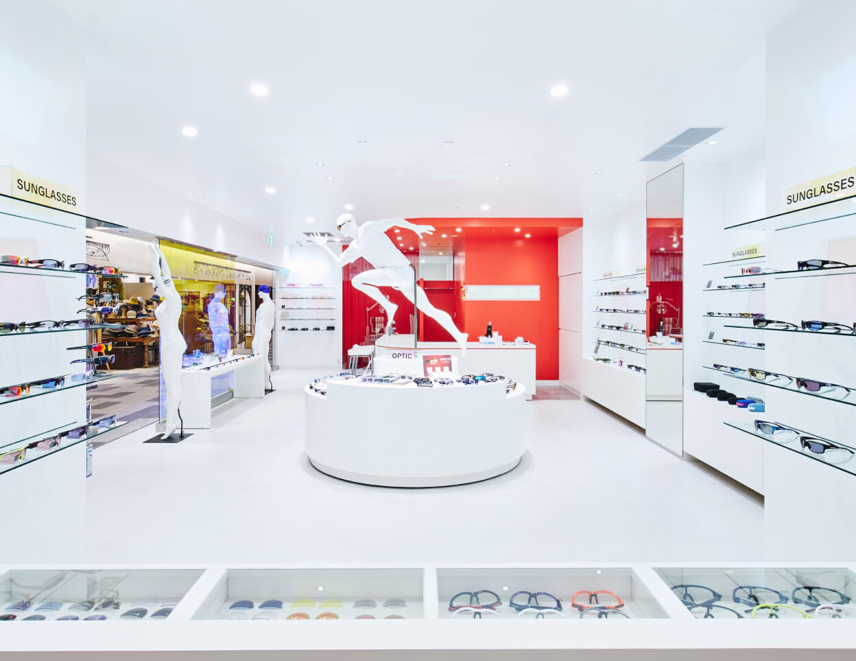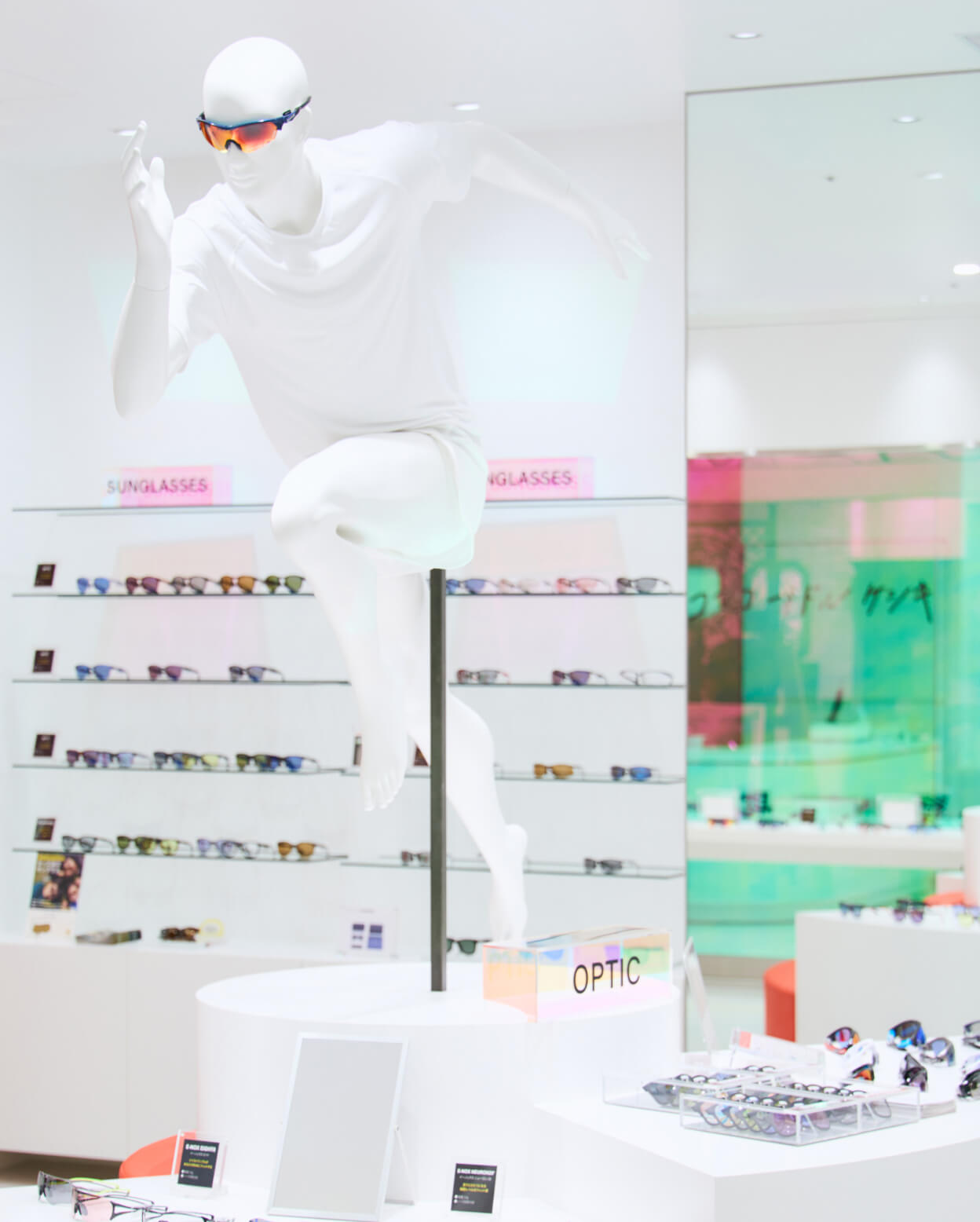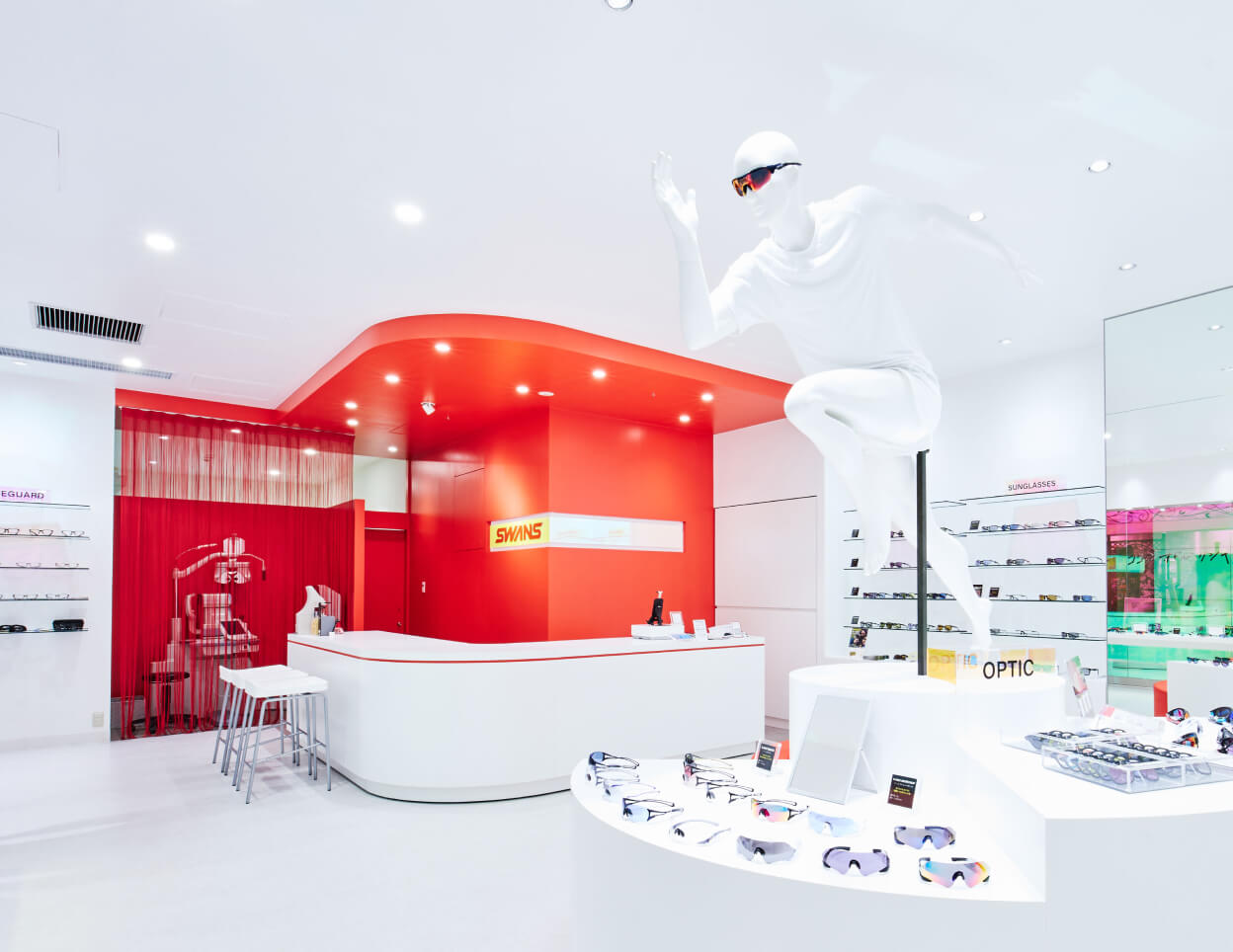 本店舗では、SWANSのアイウェアを実際に装着できるよう、マネキンのフェイス部分をカスタマイズした特別仕様を制作。製品の着用イメージをよりリアルに伝えるディスプレイを実現しました。